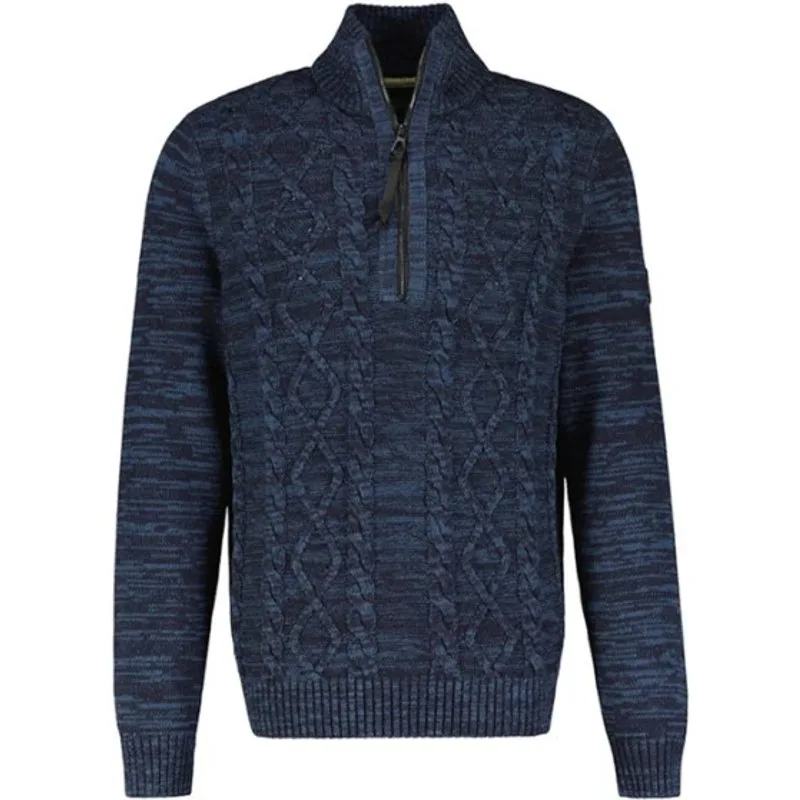 Gebreide kabel trui met opstaande kraag met ribgebreide afwerking en een ritssluiting tot op de borst. Extra details zijn: Opstaande kraag Ribgebreide afwerking RitssluitingMateriaal:60 % Katoen / 40 % PolyacrylWasvoorschrift:Machinewas max. Fijnwas 30 graden Celsius. Niet in droger