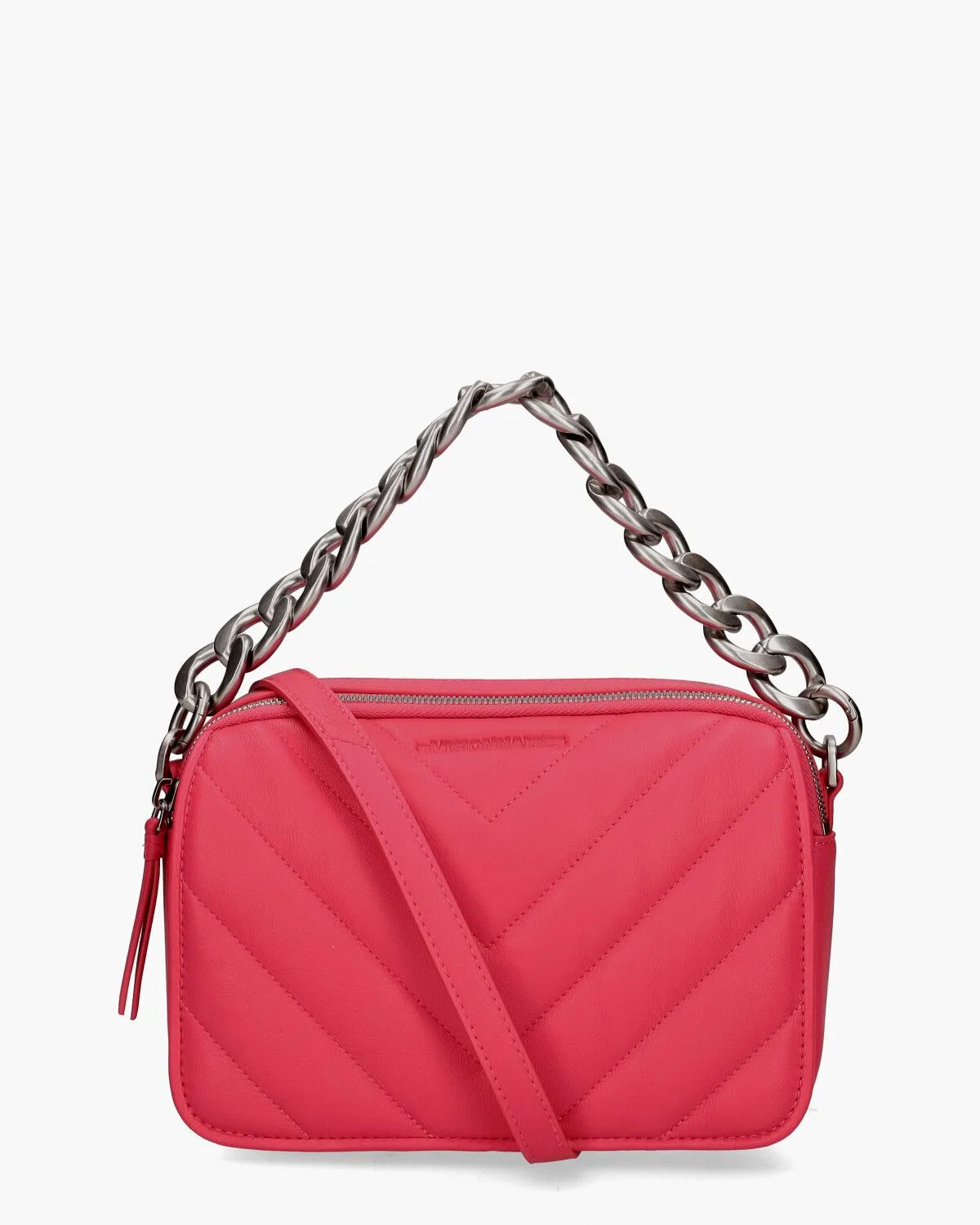 Opvallend tasje Emely Quilting uit de collectie van Les Visionnaires. Dit model is gemaakt van felroze doorgestikt leer. Het hoofdcompartiment is opgesplitst in twee delen en beide sluit je door middel van een rits. Binnenin vind je 2 steekvakjes en 4 pasjeshouders. Een extra voorvak is handig om kleine spulletjes in op te bergen. Het