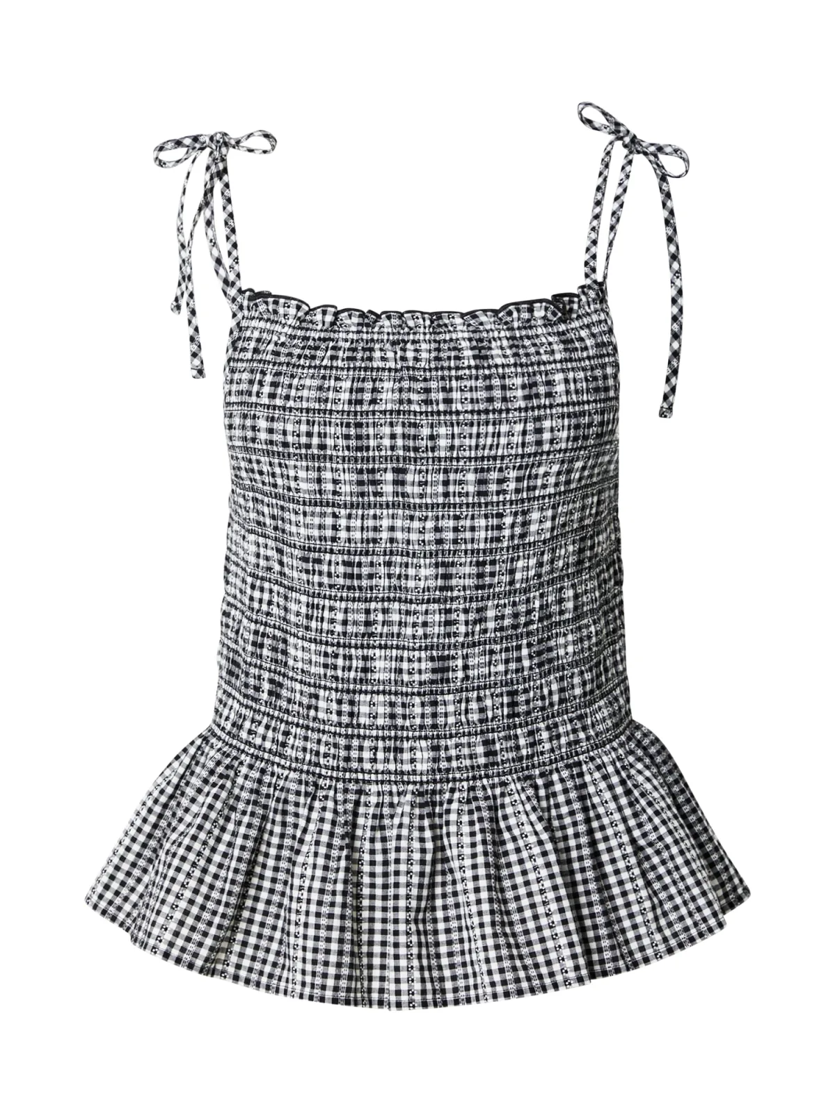 Design: Gevoerde zoom/rand, Flare, Om te knopen/binden; Materiaal: Katoen; Halstype: Carréhals; Motief: Logoprint; Soort bandjes: Normale bandjes; Details: Volant, Gedrapeerd; Extra's: All-over patroon, Met textuur; Pasvorm: Normale pasvorm; Armlengte: Mouwloos; Lengte: Normale lengte