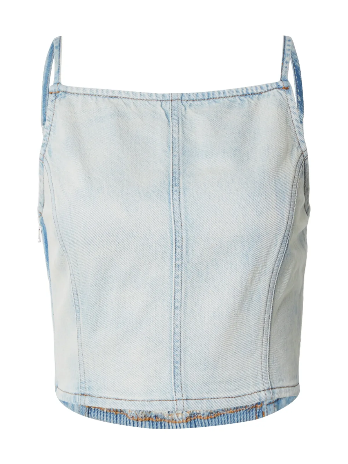 Design: Gevoerde zoom/rand, Rechte zoom; Materiaal: Denim; Halstype: Carréhals; Motief: Effen; Soort bandjes: Spaghettibandjes; Extra's: Verstelbare bandjes, Contrasterende naden, Label patch/label flag, Gewassen effect, Vaste grip; Pasvorm: Slanke pasvorm; Armlengte: Mouwloos; Lengte: Korte pasvorm