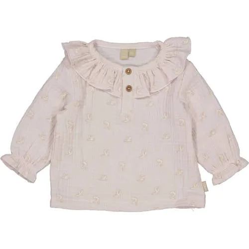Deze lichtroze meisjes blouse van LEVV uit de LEVV Newborn lijn geeft je kleintje meteen een zachte, verzorgde look. De blouse heeft een subtiele all over print en speelse ruches, waardoor het bovenstukje net wat extra uitstraling krijgt. Gemaakt van 100 procent katoen voelt de stof soepel en zacht aan op de kwetsbare babyhuid.Lichte blouse met speelse details Lichtroze kleur met all over print voor een rustige uitstraling Ruches aan de voorzijde zorgen voor een verfijnd detail Gemaakt van 100 procent katoen, zacht en comfortabel voor dagelijks dragen Lange, rechte mouwen bieden extra warmte en bescherming Ronde hals die prettig rond de nek aansluit Zonder zakken, zodat de blouse mooi slank langs het lijfje valt Wordt geleverd als losse blouse, goed te combineren met verschillende onderstukkenComfortabel in het dagelijks levenDeze blouse past goed bij rustige leggings, een effen broekje of een zacht rokje. Geschikt voor een dag thuis, een bezoekje aan familie of een fotosessie. De lange mouwen maken het bovenstukje passend voor meerdere seizoenen, met in de koudere maanden een vestje eroverheen.LEVV Newborn, aandacht voor de kleinste detailsLEVV Newborn maakt babykleding waarin comfort en draaggemak centraal staan. De ontwerpen hebben vaak subtiele details, zodat je een verzorgde outfit hebt die praktisch blijft in het dagelijks gebruik. Met deze blouse kies je voor een merk met oog voor pasvorm en zachte materialen.Een praktische basisblouse die er verzorgd uitziet en prettig voelt op de huid van de allerkleinsten.