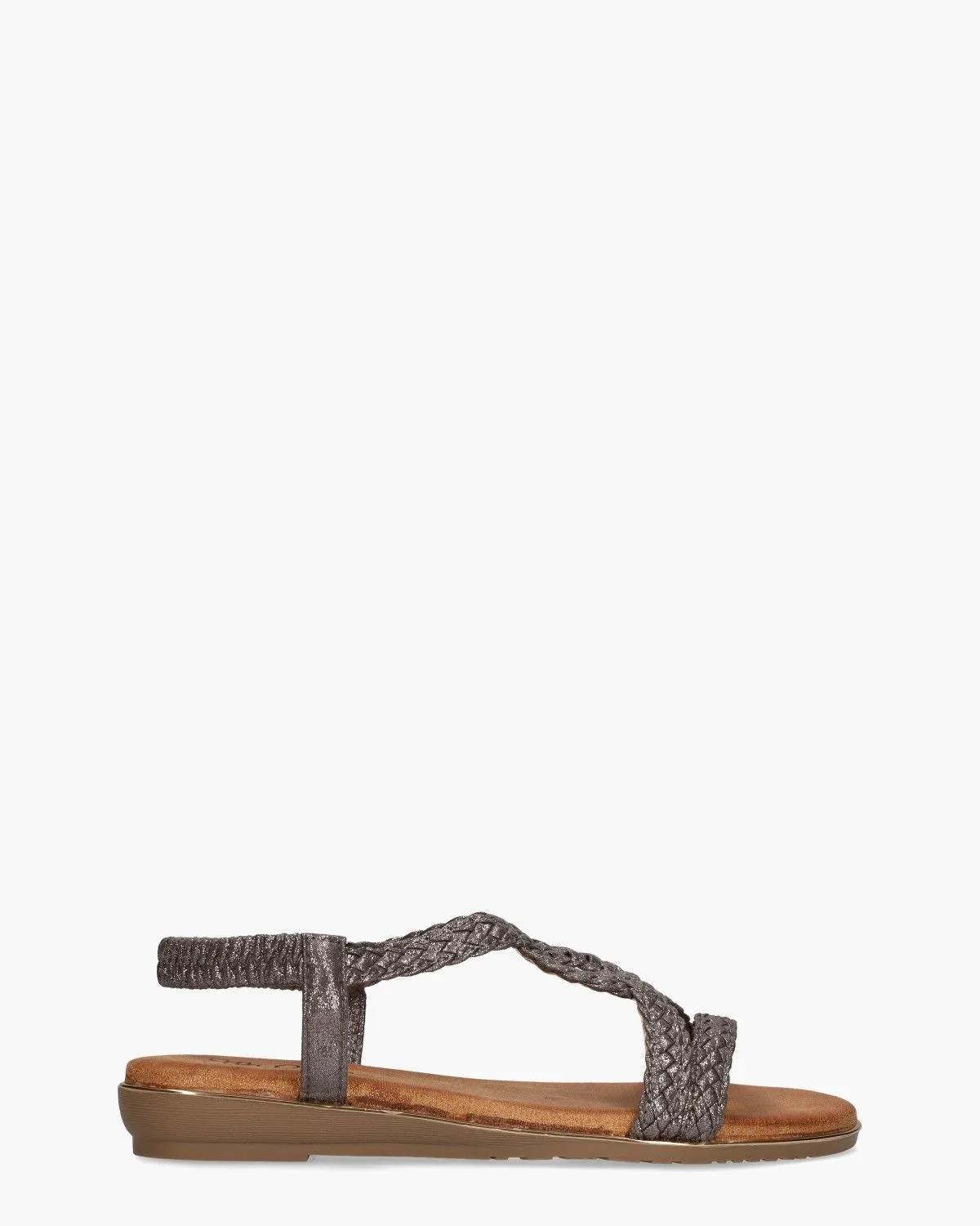 Stijlvol en comfortabel met een vleugje glamour. De Rhune sandalen van Ella Cruz zijn uitgevoerd met metallic donkergrijze synthetische bandjes in een sierlijk gevlochten glitterdesign. De elastische hielband maakt aan- en uittrekken eenvoudig en draagt bij aan een fijne fit. Het zachte kunstleren voetbed zorgt voor draagcomfort,