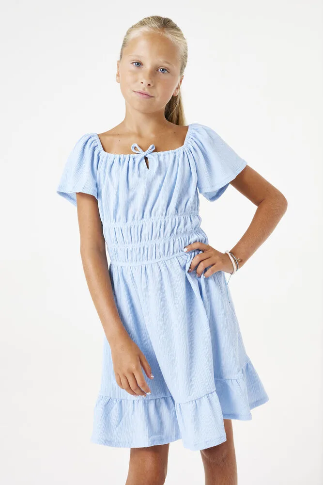 Jurk met opengewerkt detail op de rug. Een fijn en trendy item voor de zomer. Deze jurk heeft korte mouwen, een ronde halslijn en een regular fit. De jurk valt tot boven de knie. Dit item is gemaakt van 98% recycled polyster en 2% elastaan. Dit GARCIA kledingstuk is gemaakt met gebruik van recyclede garen. Recyclede materialen worden gemaakt uit restmateriaal, wat weer wordt omgezet tot grondstof.