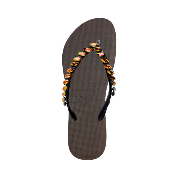 Een tijdloos ontwerp dat nooit uit de mode raakt. Deze handgemaakte slippers zijn een stijlvol statement piece dat op straat bijzonder in het oog zal vallen. Het experimenteren met edelstenen in talloze vormen, kleuren en texturen is wat onze ontwerpen kenmerkt. De V wordt gedetailleerd met het kenmerkende Uzurii logo over de bandjes. Slippers met open teen en een platte rubberzool. Rubber - PVC – Stenen Zoolhoogte: 1,5cm De V (band): Gemaakt in China Zool: Gemaakt in Brazilië