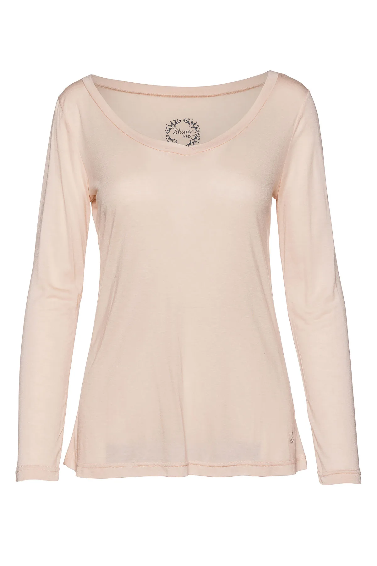 Lichtroze top met lange mouwen van jerseystof met een lichte stretch, micromodaal kasjmier. Diepe V-halslijn. Decoratief zilverkleurig strass detail linksonder. De stof is bijzonder licht en zacht tegen de huid. Kan het hele jaar door worden gedragen, alleen of in laagjes. Gemakkelijke pasvorm. Ons model is 176cm en draagt maat 36/S. Afmetingen voor maat 36/S (in cm): Schouder -38, Borst-45, Taille-44, Onderkant-51, Mouwlengte-62, Lichaamslengte-66. 90% micromodal-10% kasjmier