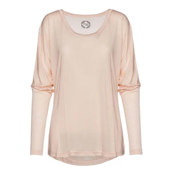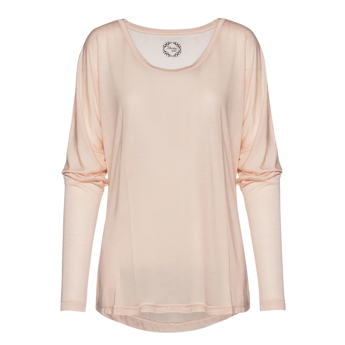 Lichtroze top van een micromodal-kasjmiermix. Lange vleermuismouwen en een ronde halslijn met een bies van 0,5 cm. Asymmetrische zoom. Kleine splitjes aan de zijkanten. Strass-detail 'S' linksonder. Recht silhouet. Ons model is 176cm en draagt maat 36/S. Afmetingen voor maat 36/S (in cm): Schouder -63, Borst-50, Taille-49, Onderkant-54, Mouwlengte-61, Lichaamslengte-69. 90% micromodal-10% kasjmier