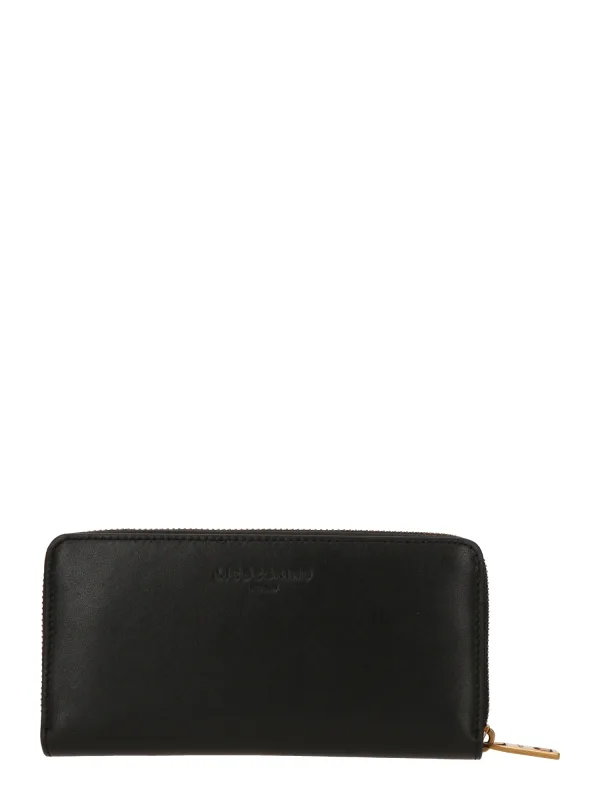 Design: Kaartvakjes, Muntenvakje, Schijnvak, Allround rits; Type sluiting: Ritssluiting; Motief: Tekst print; Materiaal: Glad leer; Extra's: All-over patroon, Stevige stof