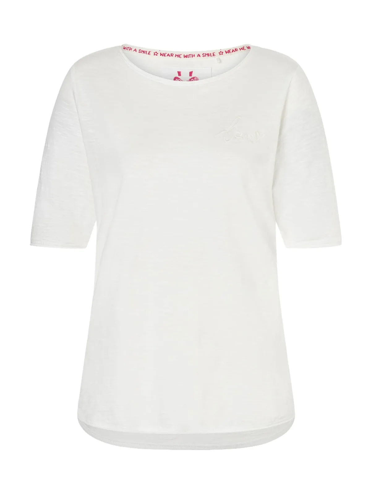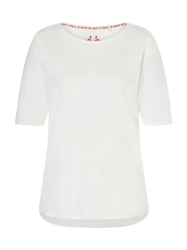 Design: Gevoerde zoom/rand, Rechte zoom, Nektape; Materiaal: Jersey; Halstype: Ronde hals; Motief: Mélange; Details: Borduursels; Extra's: Op staal naden, Voelt zacht aan; Pasvorm: Normale pasvorm; Armlengte: Halve mouw; Lengte: Normale lengte