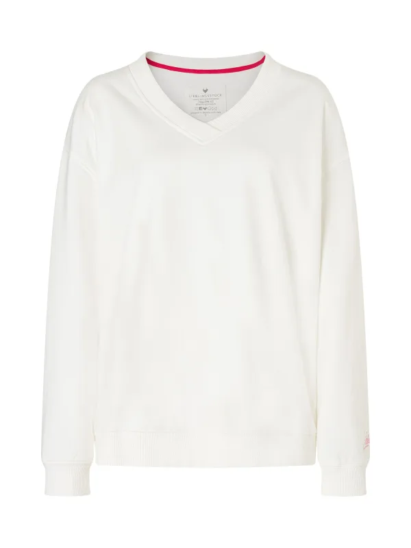 Design: Geribd ceintuurtje, Overcut schouder; Materiaal: Sweatstof; Halstype: V-hals; Motief: Tekst print; Details: Borduursels; Extra's: Op staal naden; Pasvorm: Normale pasvorm; Armlengte: Lange mouw; Lengte: Normale lengte