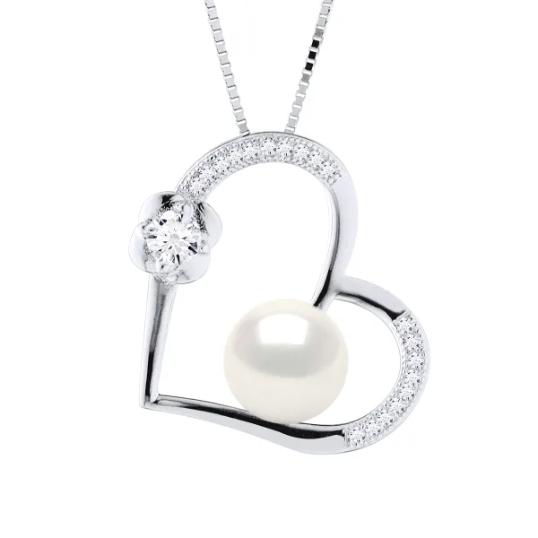 Ketting - Freshwater Pearl 8-9mm button - Patroon van het Hart & Oxides - Box Chain Rhodium 925 duizendste - Lengte: 42 cm - Wordt geleverd in een koffer met een certificaat van echtheid en een internationaal Garantie - Al onze sieraden worden vervaardigd in Frankrijk.