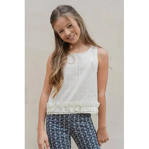 Geef haar zomerse outfit een nieuwe, frisse look met deze Like Flo top Chloe. De mouwloze meisjestop heeft een speelse streepprint en subtiele details die direct in het oog vallen. Ideaal voor warme dagen, naar school of een feestje, en makkelijk te combineren met haar favoriete short, rok of jeans.Frisse details en praktisch comfort Mouwloos model dat veel bewegingsvrijheid geeft, perfect voor actieve meisjes Ronde hals die comfortabel rond de hals valt Knoopsluiting aan de voorkant voor eenvoudig aan- en uittrekken Ruches als detail voor een verfijnde, speelse look Streepprint die de top een opvallend dessin geeft Gemaakt van 80% polyester en 20% katoen, voelt zacht aan en is makkelijk in onderhoud Zonder zakken, waardoor de pasvorm slank en rustig oogtElke dag draagbaar, van speelplein tot feestjeDeze Like Flo Chloe top past bij veel momenten op de dag. Combineer met een luchtige short voor een casual zomerse look of met een rok voor een meer aangeklede stijl. De top is licht en soepel, zodat je kind zich vrij kan bewegen tijdens spelen, sporten of dansen.Like Flo voor moderne meidenLike Flo ontwerpt kleding speciaal voor meiden die houden van comfort en een eigentijdse stijl. De collecties zijn goed op elkaar afgestemd, zodat losse items makkelijk te combineren zijn. Zo bouw je stap voor stap een garderobe op die praktisch is en er verzorgd uitziet.Een praktische top die de hele zomer goed van pas komt.