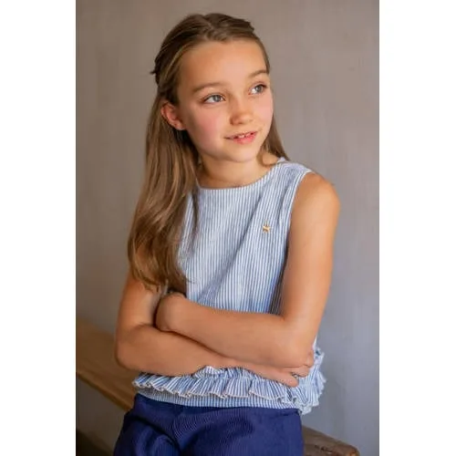 Deze mouwloze Like Flo meisjes top Chloe is een lichte en speelse basic voor warme dagen. De top heeft een zachte streepprint en subtiele ruches die zorgen voor een frisse en vrolijke uitstraling. Door de ronde hals en het rechte model draagt de top prettig bij alledaagse outfits, naar school of in het weekend.Speelse details voor elke dag Mouwloos model, ideaal voor zonnige dagen of onder een vest Zachte streepprint voor een frisse, moderne look Ruches langs de bovenkant geven een speels accent Ronde hals, comfortabel en makkelijk te combineren Knoopsluiting aan de voorkant voor eenvoudig aan- en uittrekken Gemaakt van 95% viscose en 5% elastaan voor een soepele, rekbare pasvorm Geen zakken voor een strakke, rustige uitstralingGemakkelijk te combineren zomerfavorietDeze Chloe top laat zich eenvoudig stylen met een korte jeans, een rok of een luchtige broek. De streepprint past goed bij zowel effen kleuren als andere zachte prints. Ook fijn, onder een dun vest of jasje kan de top prima door naar koelere dagen.Like Flo voor moderne meidenLike Flo ontwerpt kleding voor meiden die houden van comfort en een eigentijdse uitstraling. De collecties zijn speels, maar toch praktisch in het dagelijks leven. Met deze Chloe top haal je een doordacht item in huis dat keer op keer uit de kast gepakt wordt.Een luchtige, comfortabele top die elke dag weer makkelijk mee de outfit in gaat.