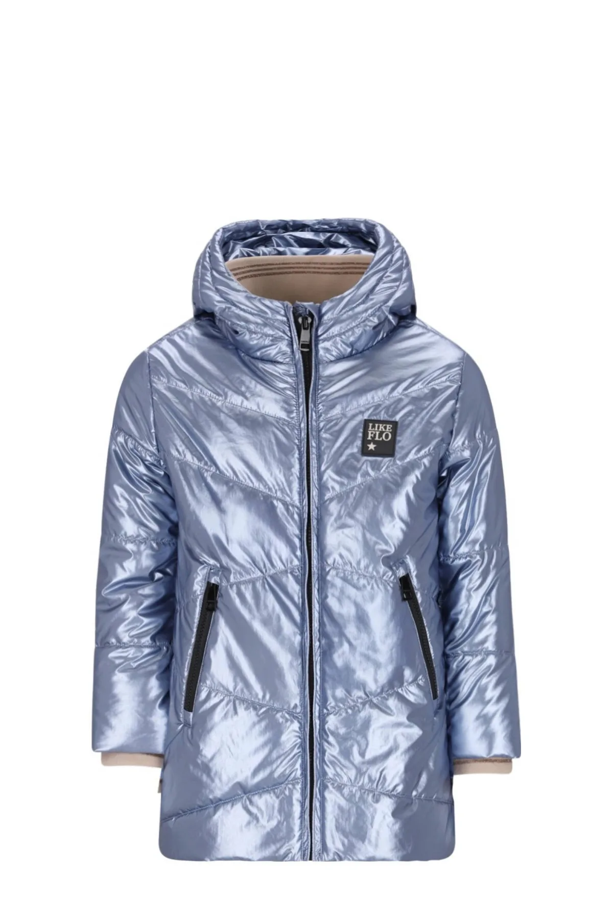Deze Like Flo jas voor meisjes heeft een capuchon en een ritssluiting. De jas is gevoerd en waterafstotend. Met glimmende details, zakken voor en een binnenzak is deze jas geschikt voor de winter.