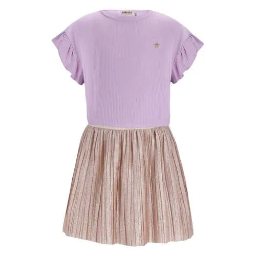 Deze Like Flo meisjes jurk Molly is gemaakt om mee te bewegen met elke stap. De lila kleur met subtiele gouden glans geeft een speelse, feestelijke uitstraling, terwijl de plisséstructuur en ruches zorgen voor een levendig silhouet. Door de soepele stof en het rekbare materiaal voelt de jurk licht aan en valt hij mooi langs het lichaam.Lichte jurk met speels plissé Korte jurk in lila/goud met effen dessin voor een rustige maar opvallende look Vlindermouwen en ruches geven extra volume en een zwierig effect Gemaakt van zachte viscose met elastaan, waardoor de stof soepel en licht elastisch is Plissé details over de jurk zorgen voor een sierlijk en verfijnd geheel Ronde hals zonder sluiting, zodat de jurk makkelijk over het hoofd gaat Zonder zakken voor een slank en rustig silhouet Geschikt voor schoolkind en tiener, passend binnen een preppy stijl Wasbaar op dertig graden en lauw strijkbaar, niet geschikt voor de droogtrommelVoor schooldagen en feestmomentenDeze jurk draagt comfortabel op een gewone schooldag en past ook goed bij een verjaardag of een etentje. De lichte stof en korte mouwen maken de jurk geschikt voor het voorjaar en de zomer, eventueel gecombineerd met een fijn vest op koelere dagen.Like Flo voor eigentijdse kidslooksLike Flo staat voor moderne kinderkleding met aansprekende kleuren en doordachte details. De collecties zijn ontworpen om goed aan te sluiten bij het dagelijks leven van actieve kinderen, met stoffen die fijn aanvoelen en modellen die gemakkelijk aan en uit gaan. Zo combineert Like Flo praktische pasvormen met een eigentijdse uitstraling.Een jurk die klaar is voor zowel gewone dagen als speciale momenten.