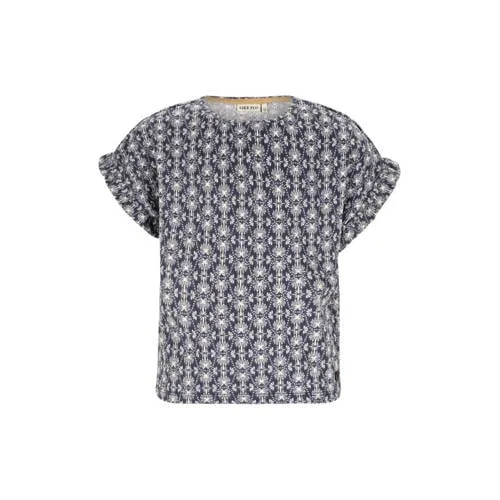 Geef haar outfit direct een speelse update met dit Like Flo meisjes T-shirt Esri in donkerblauw/ecru. De all over print en fijne ruches maken het T-shirt opvallend, terwijl de zachte stretchstof prettig meebeweegt met elke beweging. Ideaal voor naar school, een feestje of een ontspannen dag thuis.Speelse details voor elke dag Kleurcombinatie donkerblauw/ecru met all over print voor een vrolijke uitstraling Korte kapmouwen met ruches voor een speels effect op de schouders Ronde hals met fijne, geribde boord die mooi aansluit Gemaakt van 95% polyester en 5% elastaan, soepel en licht elastisch materiaal Geribde boorden zorgen voor een pasvorm die goed blijft zitten Geen zakken, waardoor het T-shirt glad valt onder een vest of jasjeComfortabel bovenstuk voor elke dagDit T-shirt is geschikt voor school, spelen of een feestje. De kapmouwen geven extra ruimte rond de schouders en armen, wat prettig is op warmere dagen. Op koelere momenten draagt het comfortabel onder een vest of jasje, zodat zij er het hele jaar door plezier van heeft.Like Flo met oog voor kinderkledingLike Flo staat voor kinderkleding met een modieuze uitstraling en een comfortabele pasvorm. De collecties volgen de nieuwste trends, maar zijn tegelijk praktisch voor dagelijks gebruik. Met dit T-shirt Esri kies je voor een betrouwbaar bovenstuk waarin zij zich vrij kan bewegen.Een speels bovenstuk voor elke dag.