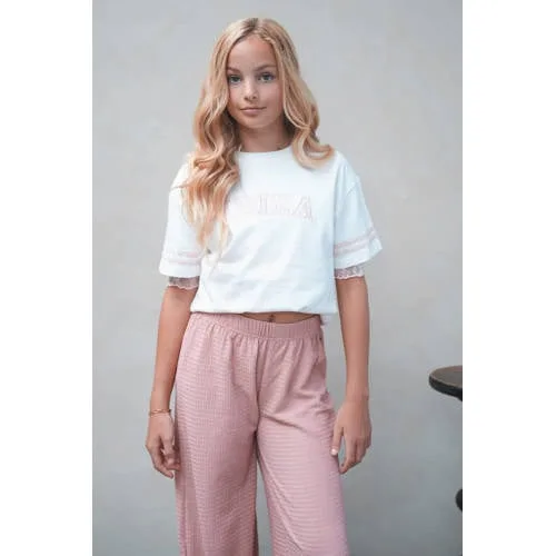 De lichtroze Like Flo meisjes top Vienna is een luchtige basic met een verfijnde twist. Deze blousetop met korte mouwen heeft een ronde hals en rechte mouwtjes, waardoor de top gemakkelijk te dragen is. De effen kleur maakt het een rustige basis, terwijl het kantdetail zorgt voor een speels en net effect. De soepele stof met een beetje stretch voelt zacht aan en beweegt mee tijdens school, spelen of een dagje weg.Lichtroze top met mooie details Lichtroze kleur die eenvoudig te combineren is met rokken, shorts of een jeans Korte mouwen en ronde hals voor een toegankelijke, dagelijkse look Kantdetail voor een subtiel, meisjesachtig accent Blousetopmodel dat luchtig valt rond het lichaam Zachte, soepele stof met stretch voor extra bewegingsvrijheid Geen sluiting, de top gaat makkelijk over het hoofd aan en uit Wasbaar op 30 graden, lauw strijkbaar en niet geschikt voor de droogtrommelVoor schooldagen en nette momentenDeze Vienna top sluit goed aan bij een preppy stijl. Geschikt voor schooldagen, een etentje of een feestje waarbij je kind er verzorgd uit mag zien en zich toch vrij kan bewegen. Combineer met een plooirok of nette broek voor een geklede set, of draag de top boven een korte broek voor een meer casual outfit.Like Flo Young: speelse mode voor schoolkidsLike Flo Young maakt kleding voor schoolkinderen en tieners met oog voor actuele trends en draagcomfort. De collecties spelen in op kleur, detail en praktisch gebruik. Zo ontstaat kleding waarin kinderen zich vrij kunnen bewegen en tegelijk netjes en verzorgd voor de dag komen.Een lichtroze top die goed meebeweegt met het dagelijkse leven van je kind.