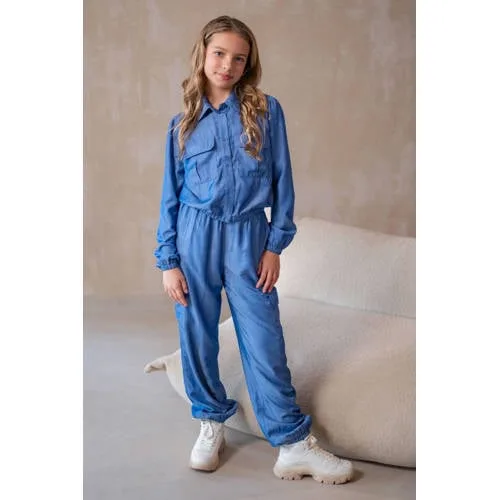 Deze Like Flo Young broek is een cargo model met een elastische tailleband. De broek heeft cargozakken en is gemaakt van katoen en polyester, met een glimmend effect en een lange lengte.