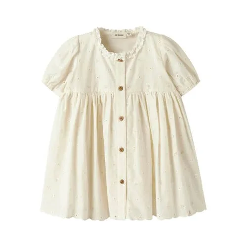 Deze offwhite meisjes jurk van katoen van LIL' ATELIER MINI is een rustige, feestelijke keuze voor bijzondere momenten. De A-lijn valt soepel langs het lichaam, waardoor je kind genoeg bewegingsvrijheid heeft om te spelen, rennen en dansen. De effen kleur en subtiele borduursels geven een verzorgde uitstraling die goed past bij gelegenheden als Suikerfeest, een bruiloft of een andere feestdag.Verfijnde details voor bijzondere dagen Gemaakt van 100% katoen, wat zacht aanvoelt en prettig draagt op de huid A-lijn model en korte lengte, ideaal voor peuters, kleuters en schoolkinderen Korte, rechte mouwen en ronde hals voor een tijdloos en kindvriendelijk silhouet Borduursels op de stof voor een verfijnde, feestelijke uitstraling Knoopsluiting maakt aan- en uitkleden eenvoudig Effen offwhite kleur die goed combineert met sandalen, ballerina's of sneakers Maatadvies: dit artikel valt normaal Praktisch in onderhoud: wasbaar op 40 graden en lauw strijkbaar (1 punt)Geschikt voor feest en familiebezoekVoor een suikerfeest, bruiloft als gast of een andere feestelijke gelegenheid biedt deze jurk een nette, maar toch speelse look. Combineer met een dun vestje of kniekousen voor extra comfort op koelere dagen.LIL' ATELIER MINI: zachte stijl voor kleintjesLIL' ATELIER MINI richt zich op kinderkleding met een rustige, zorgvuldige uitstraling. De ontwerpen hebben vaak neutrale kleuren en fijne details, waardoor ze goed passen bij zowel dagelijkse momenten als speciale gelegenheden. Je kiest hiermee voor een stijl die zacht oogt en prettig draagt voor jonge kinderen.Een comfortabele en verzorgde jurk die klaar is voor elke feestelijke dag.