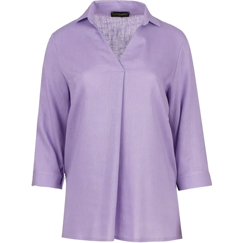 Deze zomertop is gemaakt van lila geweven stof. Het heeft een kraag met een V-hals en een plooi aan de onderkant. Het heeft ¾ lengte mouwen met manchetten die sluiten met een tone on tone plastic knoop. Het overhemd heeft zijzakken aan de binnenkant. Dit kledingstuk is gestileerd in een ontspannen subtiel A-lijn silhouet.