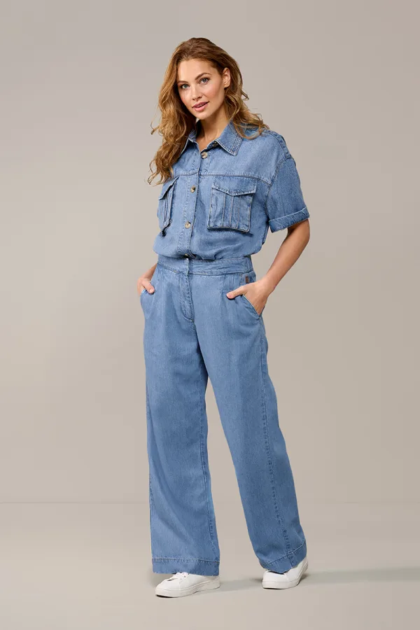De Lina denim blouse is een echte klassieker die niet mag ontbreken in je garderobe. De denim blauwe kleur geeft je direct een frisse en stralende uitstraling! Deze blouse is gemaakt van hoogwaardige lyocell, bekend om zijn soepelvallende en zachte eigenschappen. Met een oversized pasvorm en korte mouwen straalt de blouse een casual en moderne look uit. Aan de voorkant vind je twee opgestikte zakken, terwijl de elegante plooi op het achterpand een stijlvolle finishing touch biedt. De bruine gemêleerde knopen voegen een speels en uniek detail toe. De blouse met afhangende mouwen valt tot op de heup en is veelzijdig te dragen. Deze tijdloze klassieker is ook verkrijgbaar in offwhite en olijfgroen. Wil je een lange mouw? Ontdek dan ook de Berry blouse, met hetzelfde stijlvolle ontwerp!