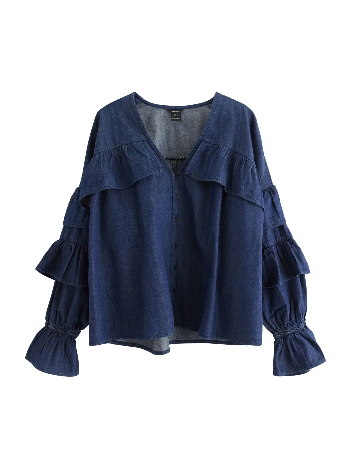 Blouse type: Klassieke blouse; Design: Gevoerde zoom/rand, Knop placket, Trompetmouwen; Type sluiting: Knoopsluiting; Materiaal: Denim; Motief: Effen; Kraag: Zonder kraag; Details: Volant; Extra's: Op staal naden, Vaste grip; Pasvorm: Losse pasvorm; Armlengte: Lange mouw; Lengte: Normale lengte