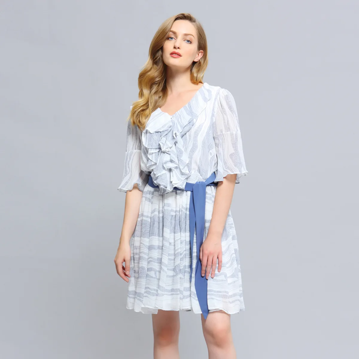 Schattig en fris Deze franje jurk heeft chique gecanneleerde mouwen en royale gegolfde jabot halslijn. Allemaal weergegeven in een minimalistische lineaire golfprint op transparante chiffon. Comfortabel met zijn elastische band op taille, is dit item stijlvol genoeg om geschikt te zijn voor elk zomerfeestje en kan toch ook worden gedragen op een casual uitje. Om op uw gemak te combineren met witte sneakers, sandalen of hakken. Een blauwe stoffenriem wordt toegevoegd om de taille nog meer te onderstrepen. Productengegevens • Vorm: fit-and-flare • Lengte: 92 cm • Mouwen: ¾ lengte, tulpvorm • kraag: rond en jabot • Knoppen midden voor op decollete