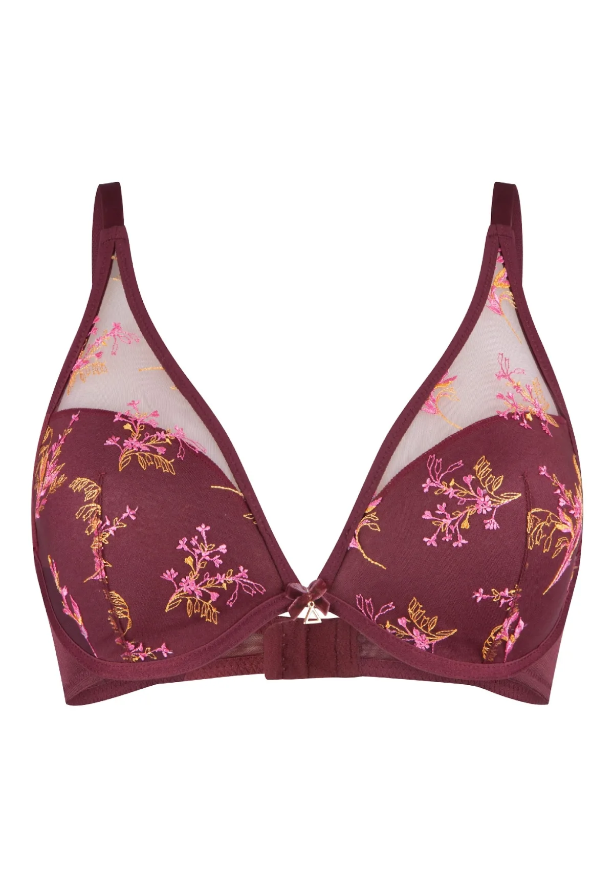 Cup soorten: Full cup bh; Soort bandjes: Normale bandjes; Bh/bikini type: Triangel; Beugel: Met beugel; Design: Diepe snit/decolleté; Type sluiting: Haakjes; Motief: Bloemenprint; Details: Borduursels; Extra's: Licht transparant, Verstelbare bandjes