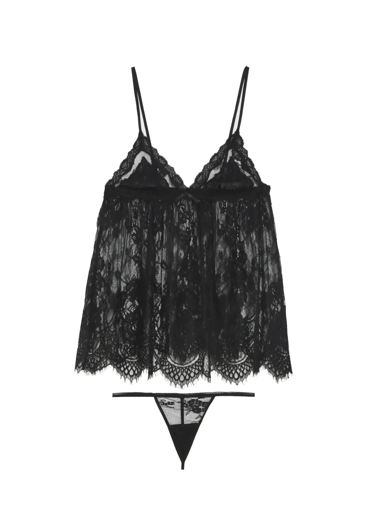 Geheel kanten dames babydoll met bijpassende string. Zowel de babydoll als de string is geheel transparant. De set heeft een luxe uitstraling doordat er gebruik is gemaakt van het hoogwaardige eyelash lace. Er is extra stof gebruikt bij de borsten, waardoor dit gedeelte minder transparant is. De schouderbandjes zijn verstelbaar. De lengte van deze babydoll is 56cm bij een maat S, exclusief schouderbandjes. De Cosmopolitan Babydoll met string is beschikbaar in de maten XS XXL. Compositie: 90% Polyamide - 10% Elasthan