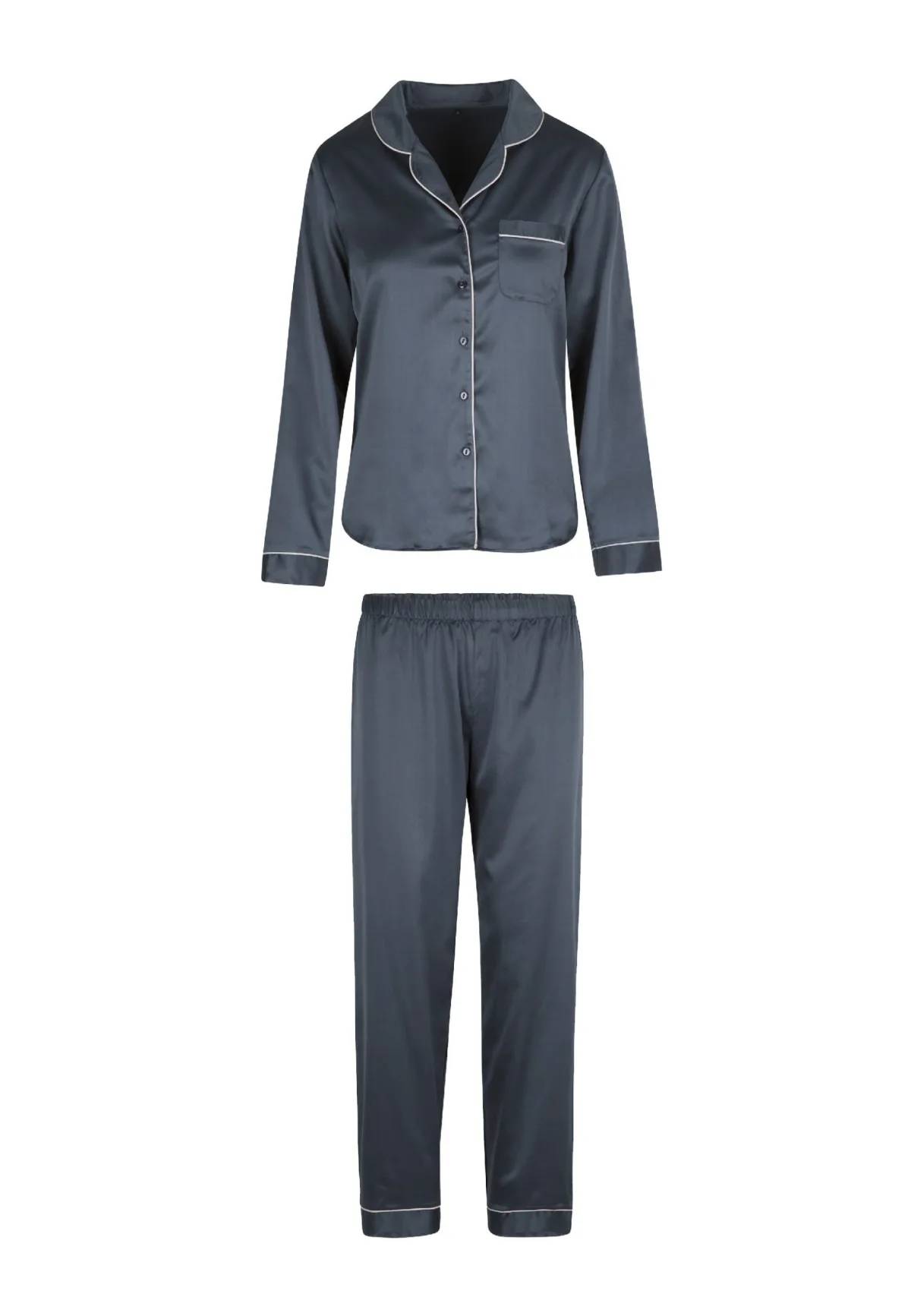 Stoer en toch vrouwelijk is deze pyjamaset uit de Nine Iron Jacquard serie. De set bestaat uit een nachthemd met lange mouwen en een lange broek. De set is gemaakt van een gladde satijnachtige leuk in de kleur nine iron. Het nachthemd heeft een kraag, borstzakje en sluit middenvoor door middel van kleine knopen. De broek heeft rechte pijpen en een elastische boord en zit hierdoor super comfortabel.