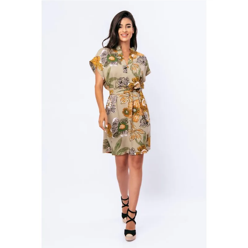 Deze zomerjurk met gedurfde bloemenprint is gemaakt van geweven viscose in linnenstijl. Het is mouwloos met een bies bij de armsgaten in dezelfde stof. Het heeft een mandarijnkraag van 2 cm en een sluiting van 4 cm bij de halslijn aan de voorkant om een V-vorm te creëren. Aan elke kant zit een binnenzak. De jurk heeft grote splitten van 20 cm aan elke kant. De jurk kan gedragen worden met de riem of zonder als je een meer ontspannen zakjurkstijl wilt creëren. De riem in dezelfde stof is inbegrepen. Dit kledingstuk heeft een recht, los silhouet.