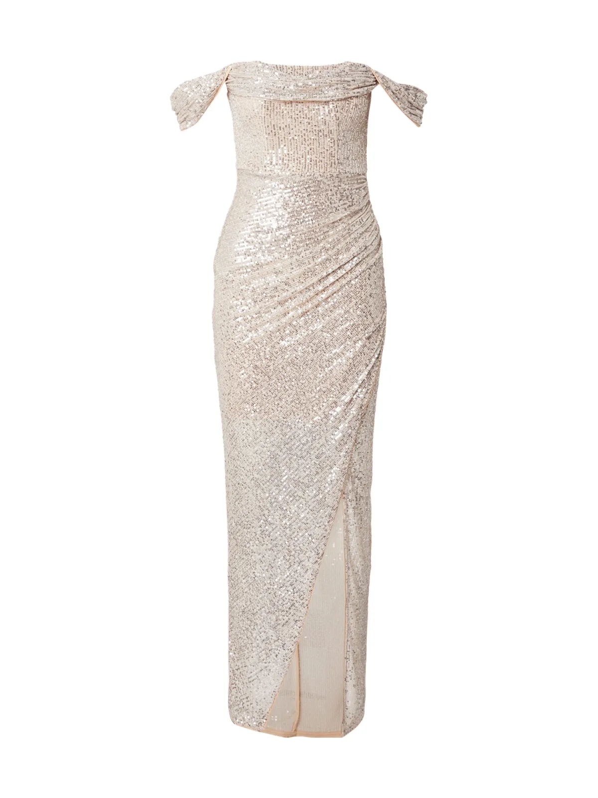 Design: Gevoerde zoom/rand, Beenopening, Rechte zoom, Rug rits, Strapless/off-shoulder; Type sluiting: Ritssluiting; Motief: Effen; Soort bandjes: Bandeau; Details: Pailletten, Gedrapeerd, Wikkel design; Extra's: Glitterend, Op staal naden; Lengte: Lang/maxi; Snit: Figuur omarmend; Pasvorm: Slanke pasvorm; Armlengte: Mouwloos