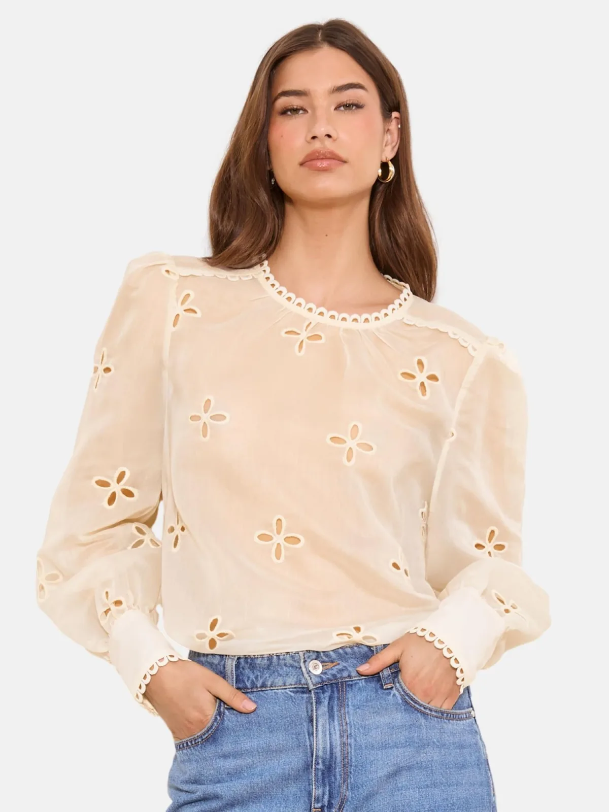 Blouse type: Blouseshirt; Design: Gevoerde zoom/rand, Keyholesluiting; Type sluiting: Knoopsluiting; Motief: Bloemenprint; Details: Cut-outs, Borduursels; Extra's: Lichte stof; Pasvorm: Normale pasvorm; Armlengte: Lange mouw; Lengte: Normale lengte