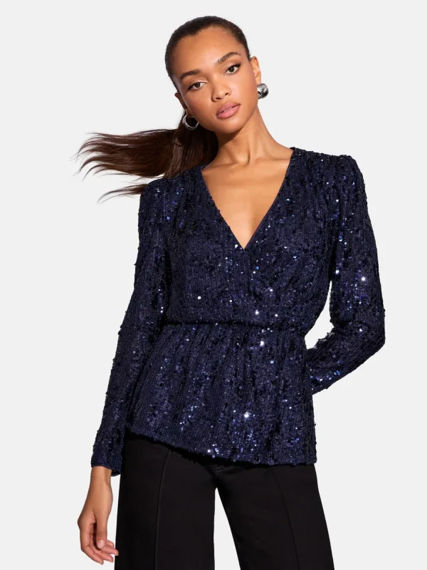 Blouse type: Blouseshirt; Design: Elastische taille/zoom, Diepe snit/decolleté; Kraag: Zonder kraag; Details: Pailletten, Gedrapeerd, Wikkel design; Extra's: Glitterend, Applicaties, Gestructureerd oppervlak; Pasvorm: Normale pasvorm; Armlengte: Lange mouw; Lengte: Normale lengte