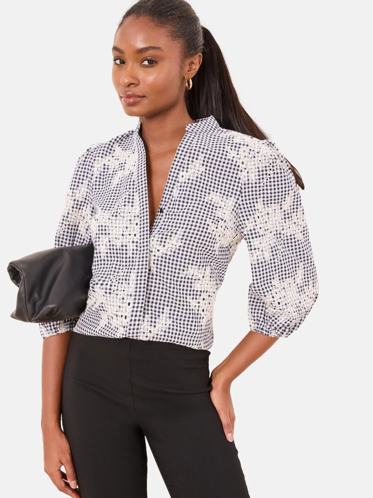 Blouse type: Klassieke blouse; Design: Gevoerde zoom/rand, Rechte zoom; Type sluiting: Knoopsluiting; Materiaal: Katoen; Kraag: Zonder kraag; Details: Borduursels; Extra's: All-over patroon, Voelt zacht aan; Pasvorm: Normale pasvorm; Armlengte: Driekwart mouw; Lengte: Normale lengte