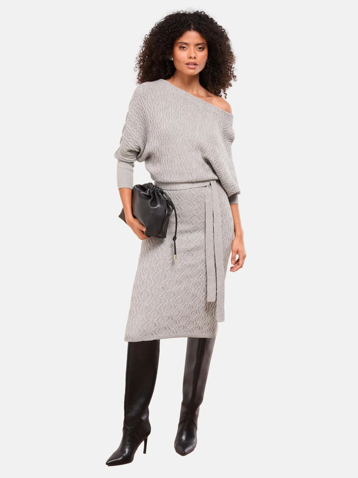 Design: Geribd ceintuurtje, Om te knopen/binden; Materiaal: Knitwear; Halstype: Carmen hals; Motief: Mélange; Extra's: Fully fashioned, Met textuur; Lengte: Knielengte; Snit: Getailleerd; Pasvorm: Normale pasvorm; Armlengte: Lange mouw