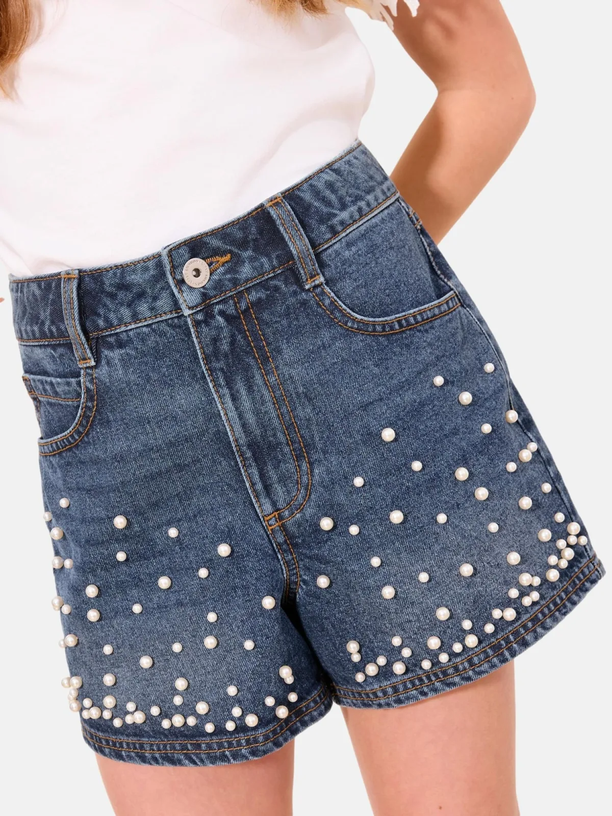 Design: 5-pocket-style; Type sluiting: Knoopsluiting; Materiaal: Denim; Extra's: Applicaties, Riemlussen; Lengte: Kort/mini; Pasvorm: Normale pasvorm; Pasvorm: Regular
