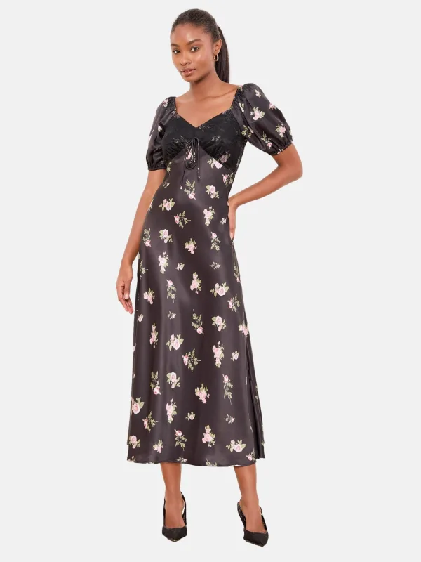 Design: Elastische taille/zoom, Pofmouwen, Elastische inzetstukken; Materiaal: Satijn; Halstype: V-hals; Motief: Bloemenprint; Details: Gedrapeerd; Extra's: All-over patroon; Lengte: 7/8 lengte; Snit: Getailleerd; Pasvorm: Slanke pasvorm; Armlengte: Kwartmouw