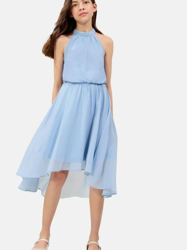 Design: Asymmetrische zoom, Keyholesluiting; Type sluiting: Knoopsluiting; Materiaal: Chiffon; Halstype: Opstaande kraag; Motief: Effen; Soort bandjes: Haltermodel; Details: Cut-outs, Gedrapeerd; Extra's: Op staal naden, Gladde stof; Lengte: Knielengte; Snit: Getailleerd; Pasvorm: Normale pasvorm; Armlengte: Mouwloos