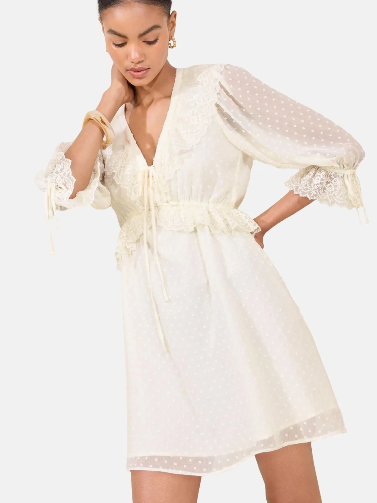 Design: Elastische taille/zoom, Om te knopen/binden, Elastische inserts; Type sluiting: Elastische band; Halstype: Uitgesneden hals; Motief: Effen; Details: Ruches, Kant; Extra's: Op staal naden; Lengte: Kort/mini; Pasvorm: Normale pasvorm; Armlengte: Driekwart mouw