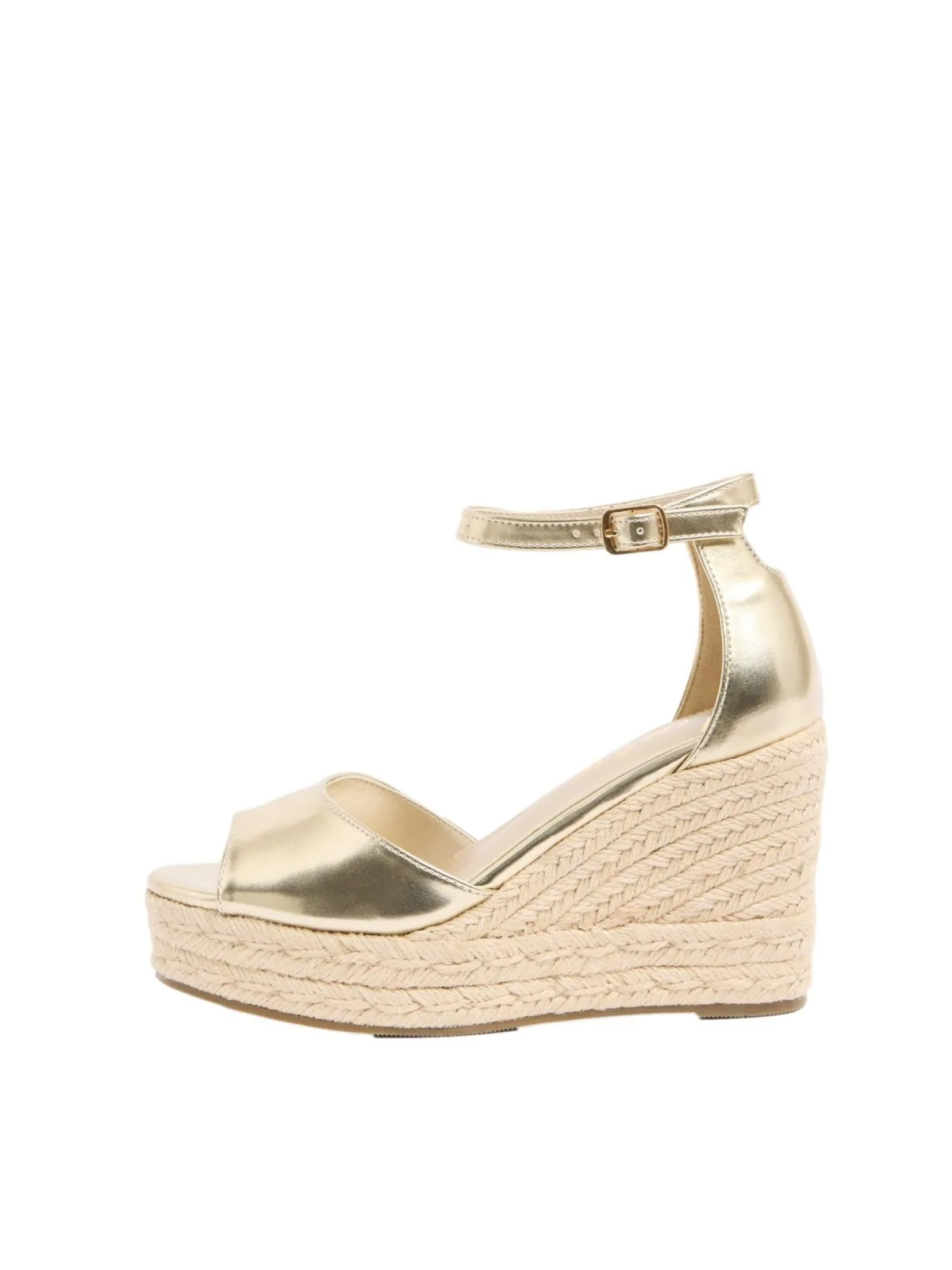 Design: Verstelbare riemen, Hak/zool met raffia-look; Type sluiting: Riemsluiting; Type hak: Sleehak; Materiaal: Imitatieleder; Motief: Effen; Plateau: Met plateau; Materiaal: Imitatieleer; Schoenneus: Open toe; Extra's: Glanzend, Metallic look; Hakhoogte: High heels (> 10 cm); Pasvorm van de schoenen: Breed