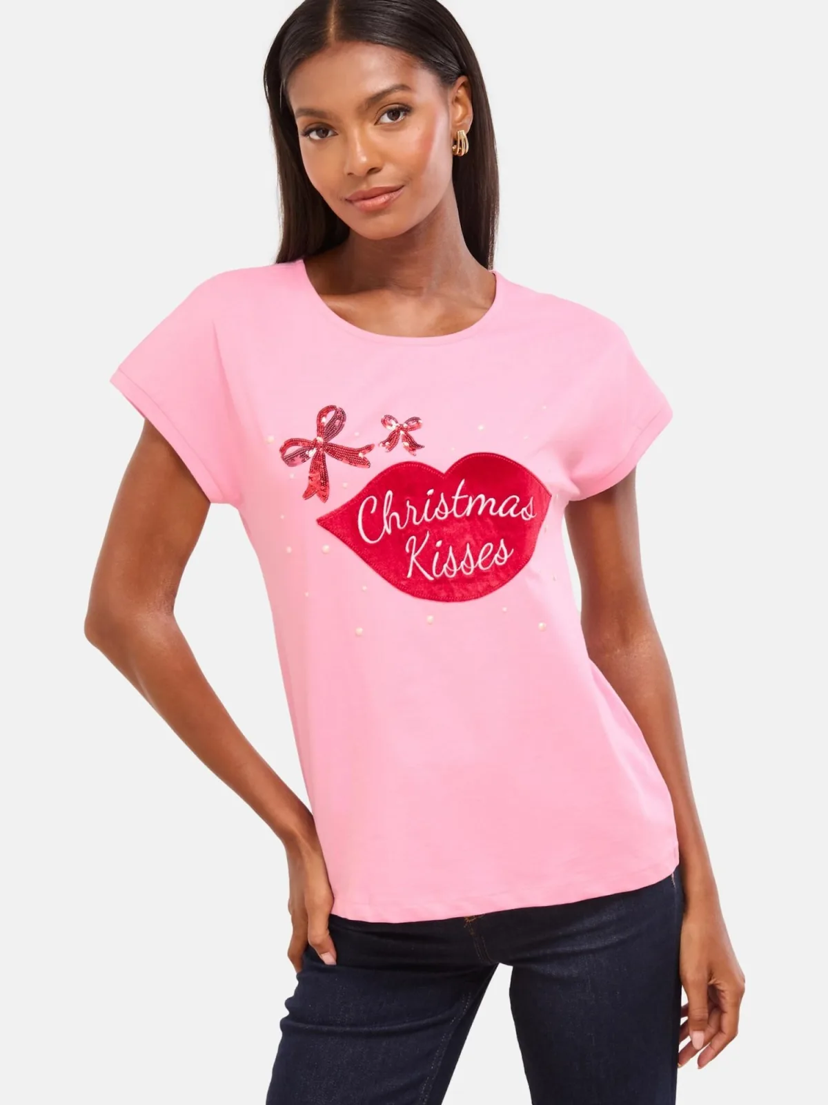 Design: Gevoerde zoom/rand, Recht model, Kerstdesign; Materiaal: Jersey; Halstype: Ronde hals; Motief: Motiefprint; Details: Pailletten; Extra's: Glitterend, Op staal naden; Pasvorm: Normale pasvorm; Armlengte: Kwartmouw; Lengte: Normale lengte