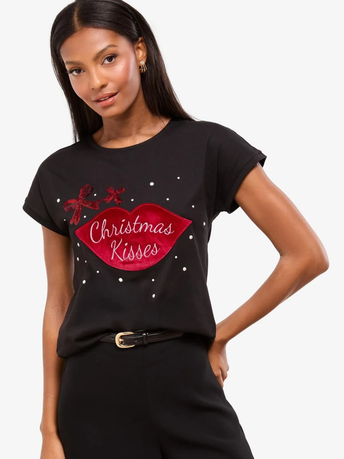 Design: Gevoerde zoom/rand, Kerstdesign; Materiaal: Jersey; Halstype: Ronde hals; Motief: Motiefprint; Details: Pailletten; Extra's: Glitterend, Op staal naden; Pasvorm: Normale pasvorm; Armlengte: Kwartmouw; Lengte: Normale lengte