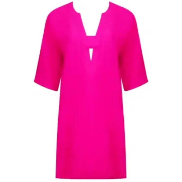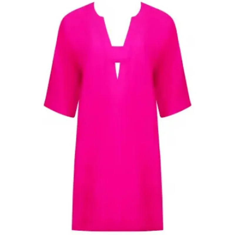 De losse cover-up, makkelijk te dragen. Knie-lengte. 3/4 mouw tuniek van delicate katoen-zijde. Diepe halslijn met een bies die het decolleté bedekt. Zijsplitten.