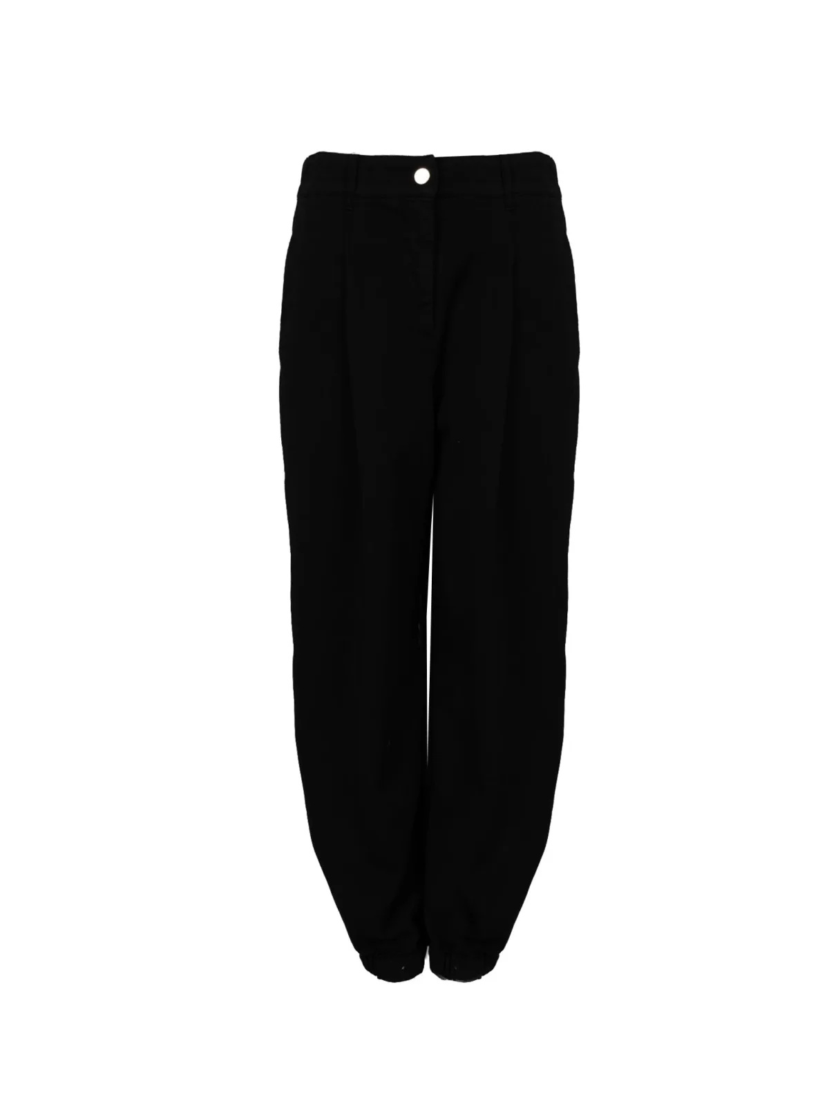De losse snit zorgt ervoor dat deze broek niet alleen stijlvol maar ook uiterst comfortabel is, ideaal voor elke gelegenheid, van alledaagse uitstapjes tot meer formele bijeenkomsten. De hoge taille benadrukt de taille en voegt elegantie toe terwijl hij de hele dag comfort biedt. De licht taps toelopende pijpen, die eindigen met een manchet, geven de broek een moderne look en zorgen tegelijkertijd voor bewegingsvrijheid en een perfecte pasvorm voor elk figuur. Hij wordt gesloten met een rits en een knoop met merklogo, wat hem een speciaal karakter geeft en de aandacht voor detail benadrukt. De steekzakken zijn niet alleen praktisch maar ook esthetisch, bieden ruimte voor kleine spullen en verhogen de functionaliteit van de broek. Op de linkerpijp is de geborduurde merknaam een subtiel maar effectief accent dat de authenticiteit en het prestige van het product benadrukt. Gemaakt van hoogwaardige stof garandeert deze broek duurzaamheid en comfort en een elegante uitstraling voor een lange tijd.