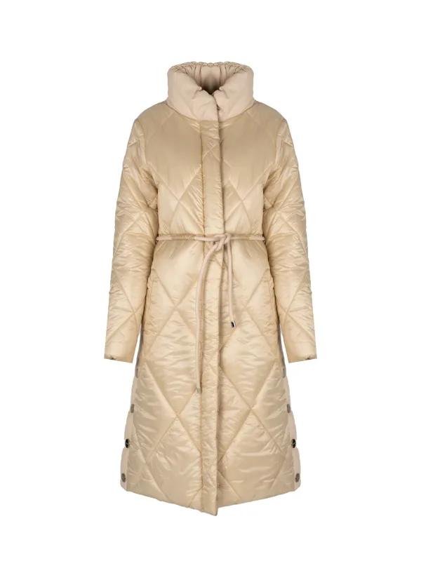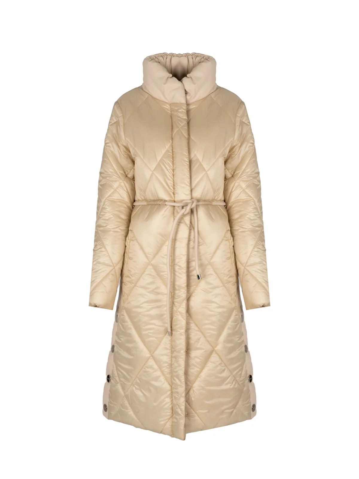 Deze klassieke, eenvoudige snit maakt het jasje zeer veelzijdig en geschikt voor vele stijlen, zowel voor casual als voor elegantere gelegenheden. De kraag geeft het jack elegantie en beschermt tegen de wind, waardoor het een ideale keuze is voor koelere dagen. Een dubbele sluiting met rits en drukknopen garandeert extra bescherming tegen de kou en comfort tijdens het dragen. De tailleband zorgt ervoor dat de jas perfect bij het figuur past, benadrukt de taille en voegt vrouwelijke charme toe. Praktische, diepe zakken aan de voorkant zijn ideaal voor het opbergen van kleine benodigdheden zoals sleutels of een telefoon. De drukknopen met logo aan de zijkanten zijn een subtiel maar stijlvol accent dat de hoge kwaliteit en opvallende kenmerken van het jack benadrukt. Een print met de merknaam op de voorkant is een elegant detail dat het jack prestige geeft en de authenticiteit bevestigt. Het jack is gemaakt van hoogwaardige stof die duurzaamheid, comfort en uitstekende bescherming tegen ongunstige weersomstandigheden biedt.