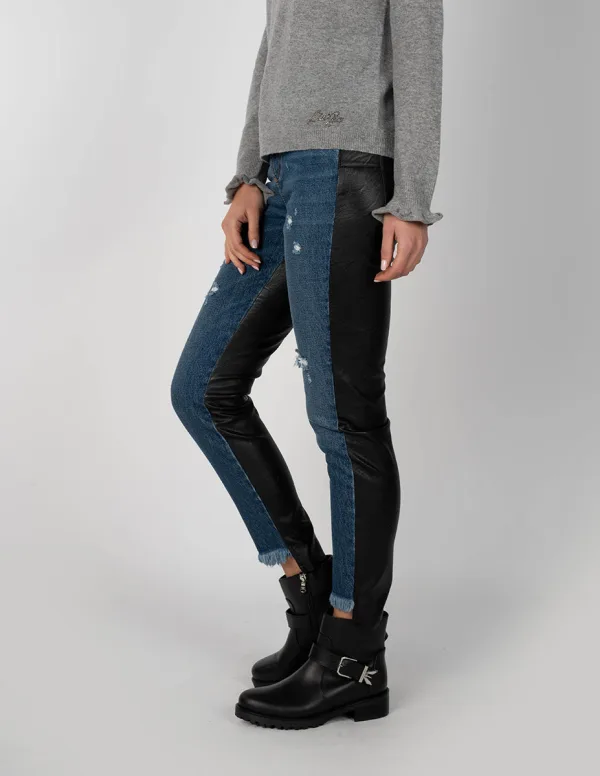 Eenvoudige snit Hoge tailleband Taps toelopende pijpen Sluiting met rits en merkknoop Drie zakken aan de voorkant, twee aan de achterkant Merkdetail op de achterzak Met ingesloten broche Gemaakt van hoogwaardig denim en kunstleer