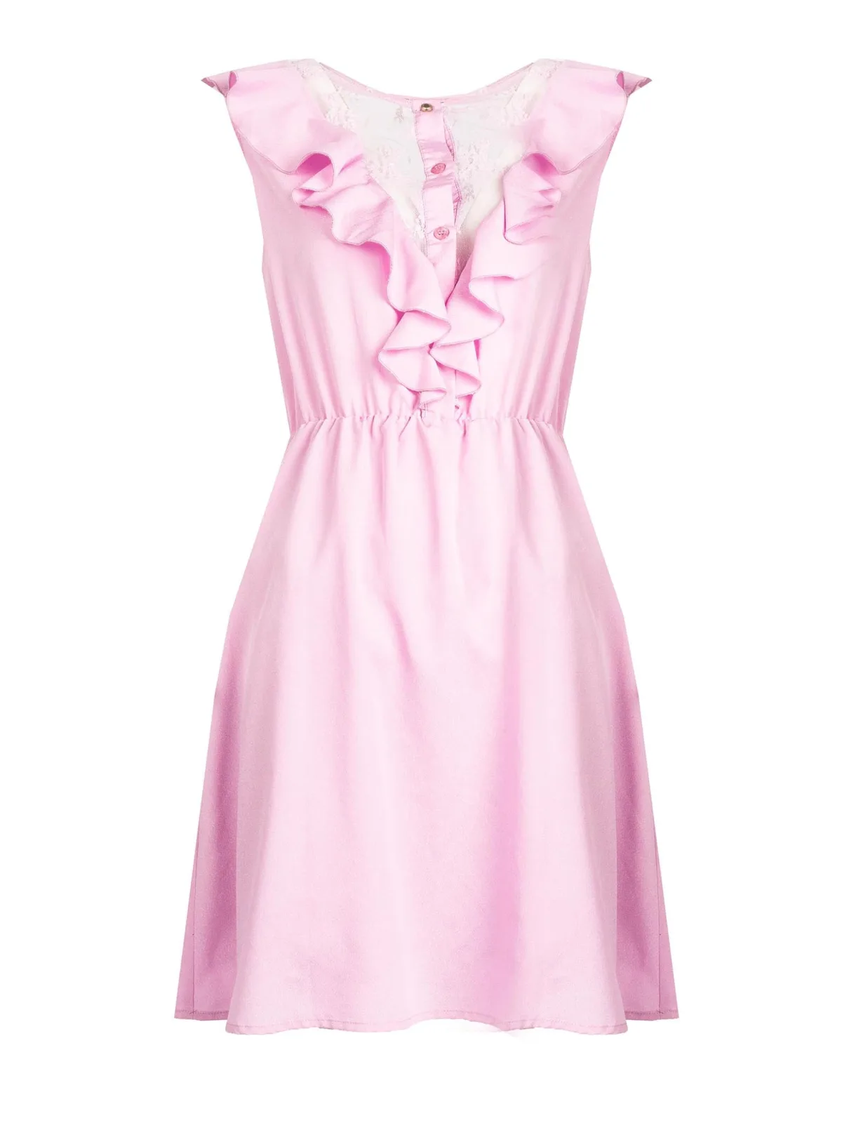 Perfecte pasvorm In minilengte, kniehoog C-hals Sluit aan de voorkant met knopen Elastische tailleband in de taille Versierd met ruches en kant aan de voor- en achterkant Bedrijfsdetail aan de hals Gemaakt van hoogwaardige stof