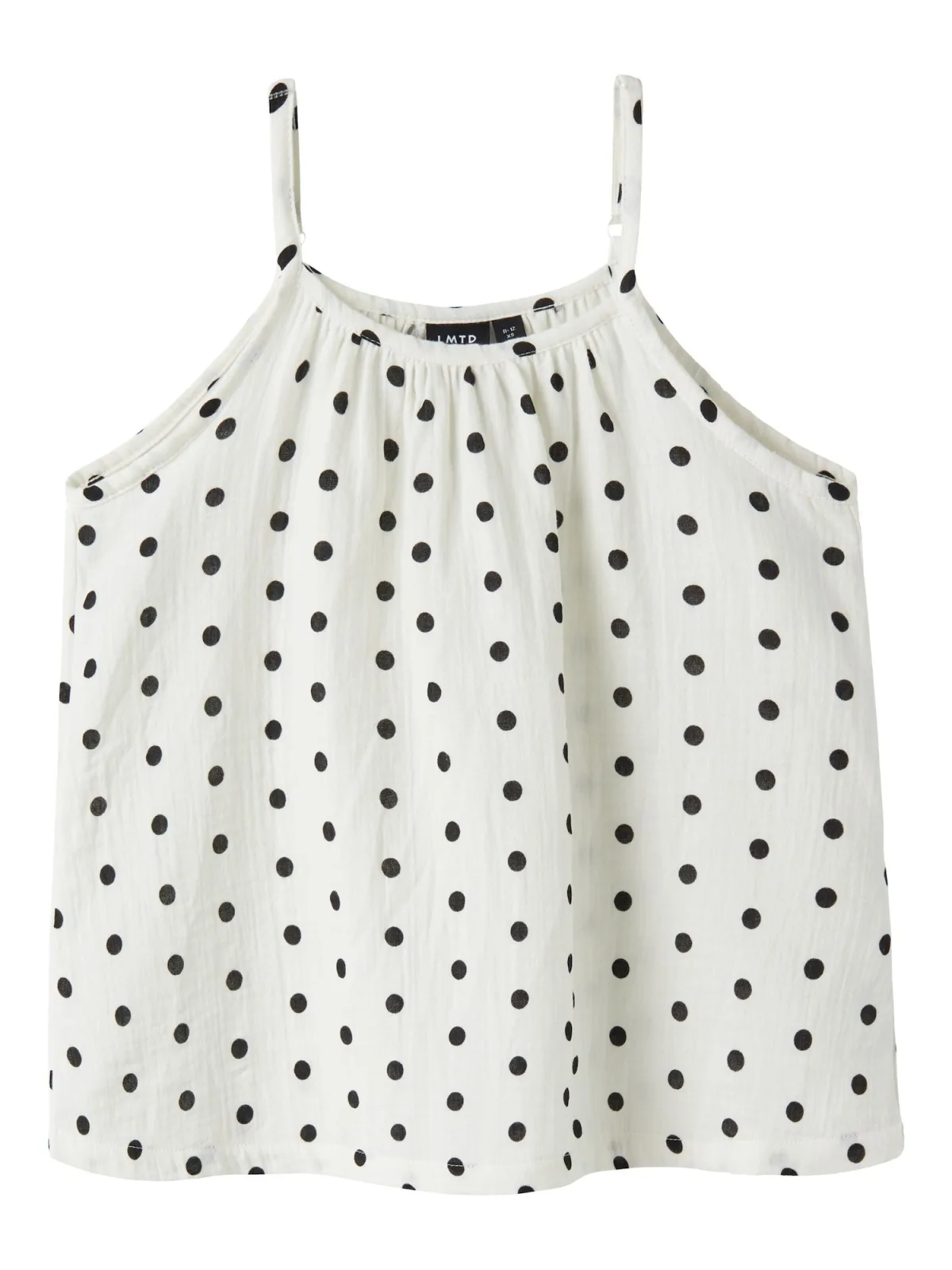 Design: Gevoerde zoom/rand; Materiaal: Mousseline; Halstype: Ronde hals; Motief: Gestippeld; Soort bandjes: Spaghettibandjes; Details: Gedrapeerd; Extra's: Verstelbare bandjes, All-over patroon; Pasvorm: Normale pasvorm; Armlengte: Mouwloos; Lengte: Normale lengte