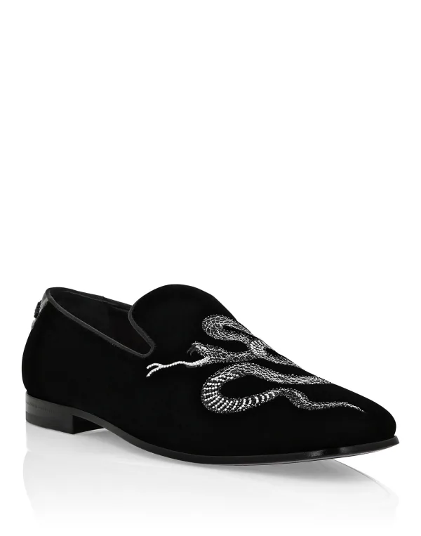 Avondschoenen zijn het must-have kledingstuk voor je elegantie. Kijk naar Pleins herziene slip-on versie. Zie hoe details het verschil maken. Fluwelen bovenzijde Geborduurde slang met juwelen op de bovenzijde Afwerking met grosgrain biesjes Patent hiellipje met metalen merk Zool van echt leer Logo met hot stamp op de buitenzool Nappaleren voering Doorgestikt satijnen voetbed met ruitjes