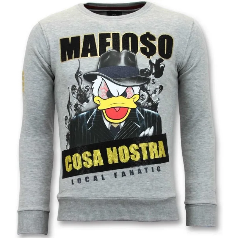 Exclusieve Sweater Heren - Cosa Nostra Mafioso - Grijs - Specificaties:- Exclusieve Sweater Heren - Cosa Nostra Mafioso Trui- Artikelcode:11-6381G- Kleur: Grijs- Seizoen: Voorjaar / Najaar- Kraag: Ronde Kraag- Mouwen: Lange Mouw- Patroon: Print, Rhinestone- Kwalitatief: Hoogwaardige Afwerking- Materiaal: 84% Katoen en 16% Lycra- Weefsel: Geweven- Pasvorm: Getailleerd Italiaans- Wasvoorschrift: Handwas, Binnenste buiten wassen (Niet in de droger)- Beschikbare maten: S - M - L - XL - XXLLocal Fanatic is een jong merk voor modebewuste mannen die aandacht besteden aan kleding en uiterlijk met de Allure en Glamour. Kenmerkend van het merk zijn de zeefdruk- en digitaal prints die gegarandeerd staan voor kwaliteit van vooruitstrevende stoffen in Italiaanse pasvormen.
